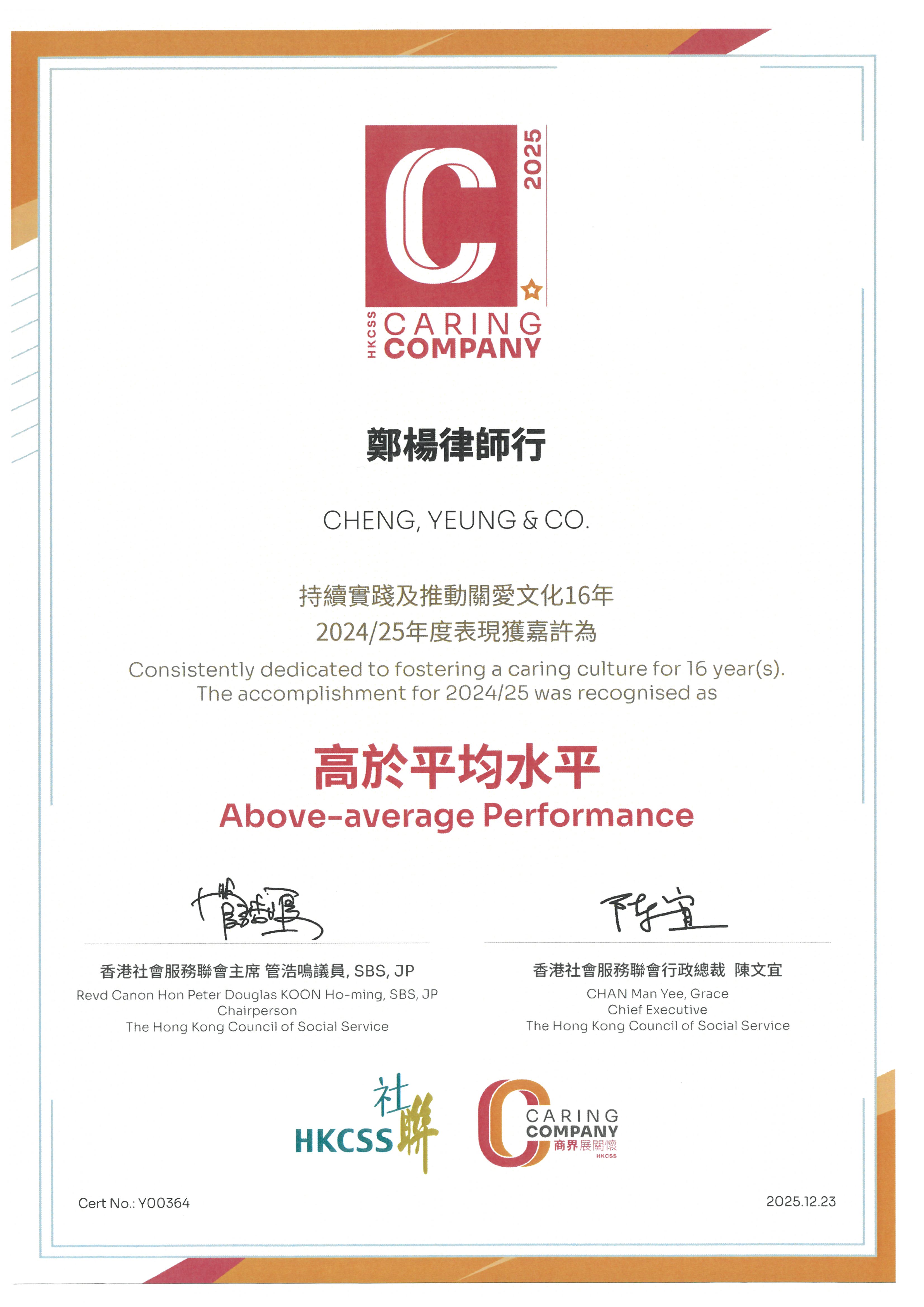 Cheng, Yeung & Co. is proud to announce that we have been recognized under the Caring Company Scheme for 16 consecutive years, reaffirming our long-standing commitment to fostering a caring and inclusive corporate culture. In the 2024/25 assessment year, the Firm attained a recognition of Above-average Performance.