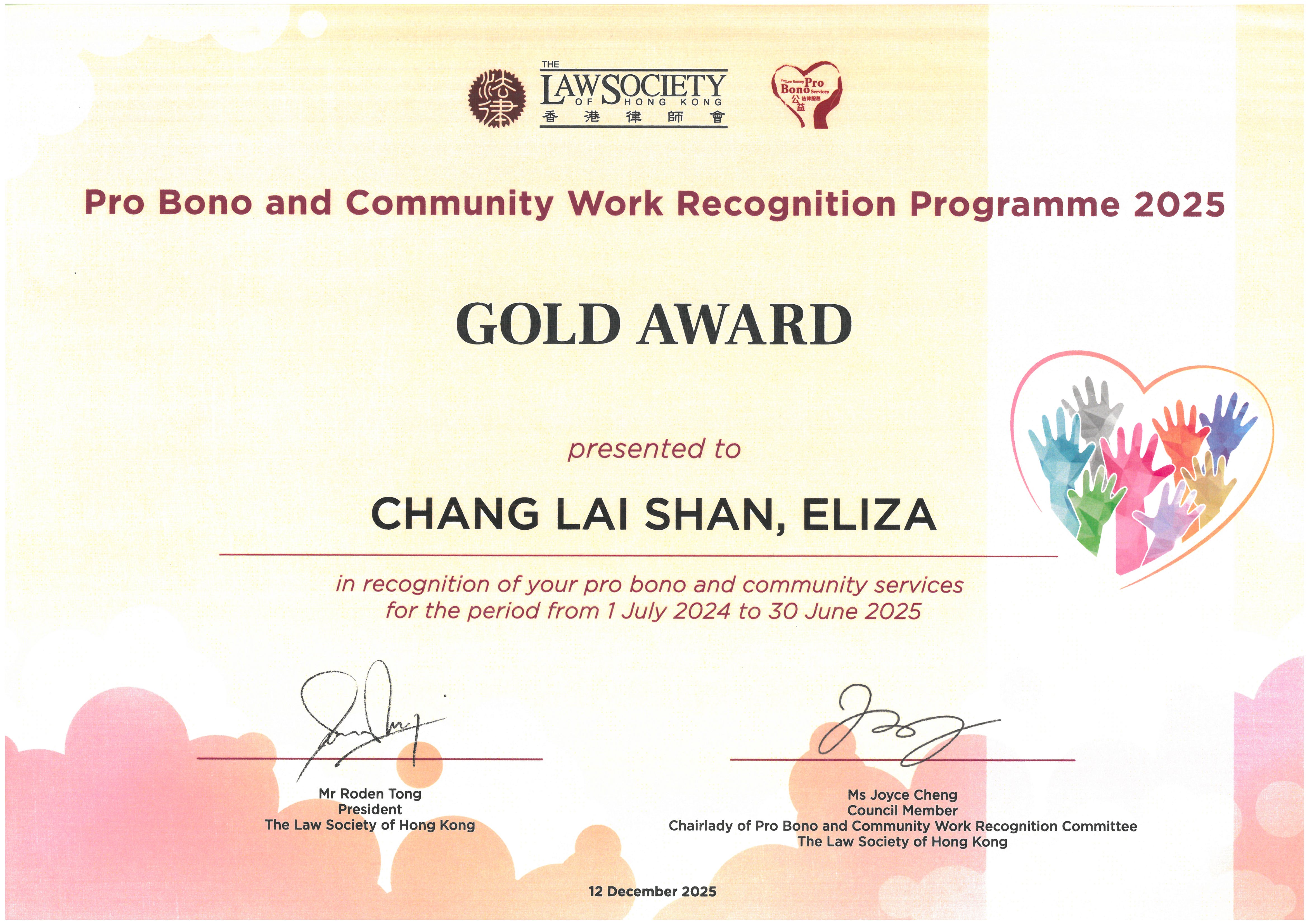 - Ms. Eliza Chang Lai Shan, Managing Partner –Individual Gold Award