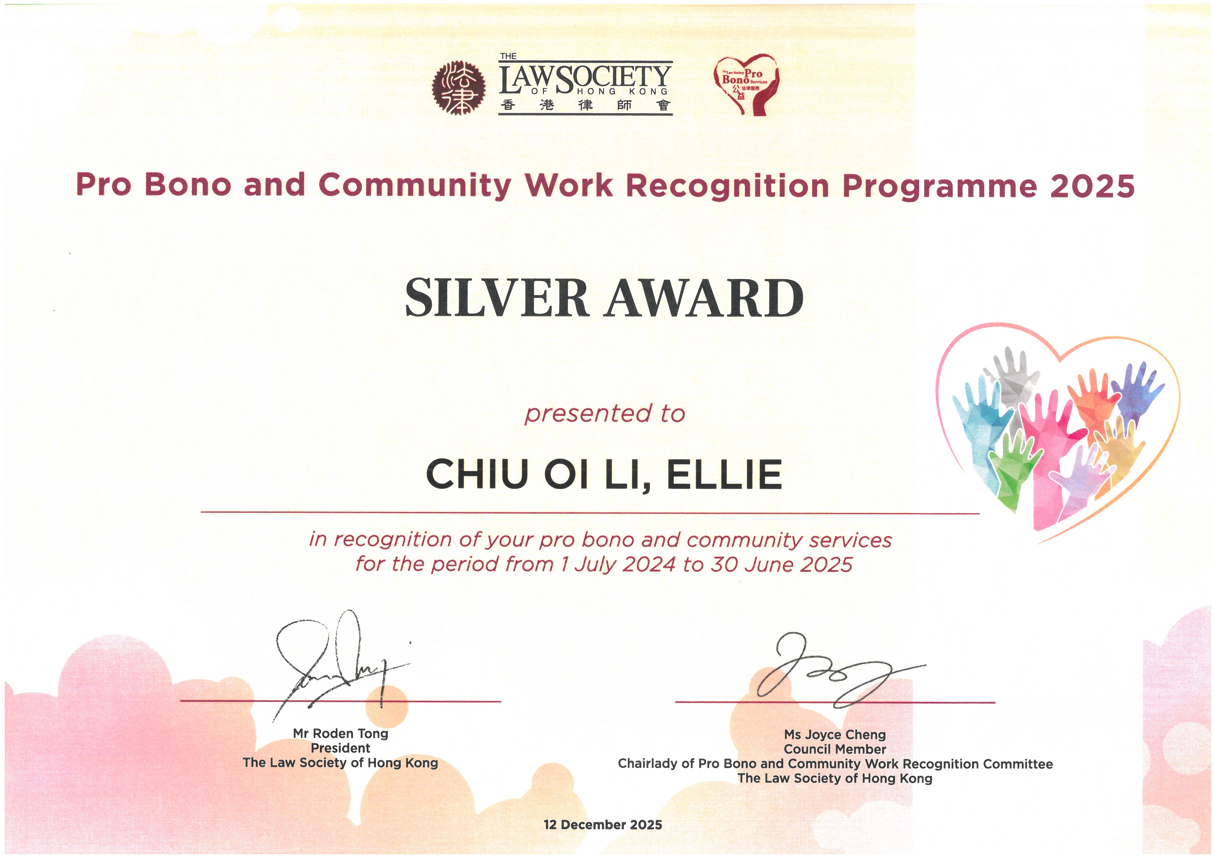 We are proud to announce that Cheng, Yeung & Co. has been honoured with the Law Firm Silver Award under the Pro Bono and Community Work Recognition Programme 2025, organized by The Law Society of Hong Kong.